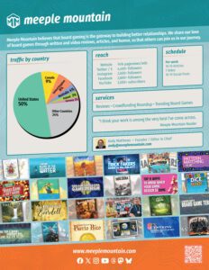 Greetings and thanks for your interest in Meeple Mountain, we’re excited to be working with you. For convenience sake we’ve made a number of assets available for your download.